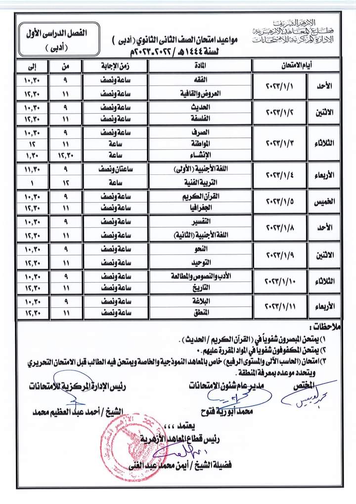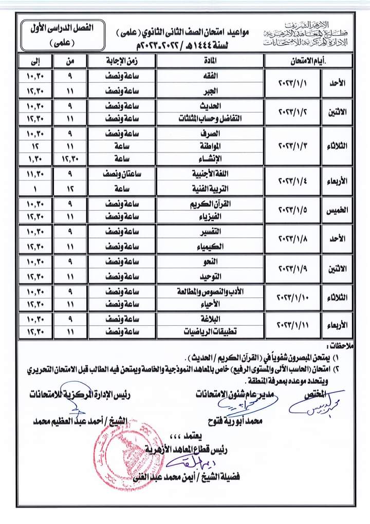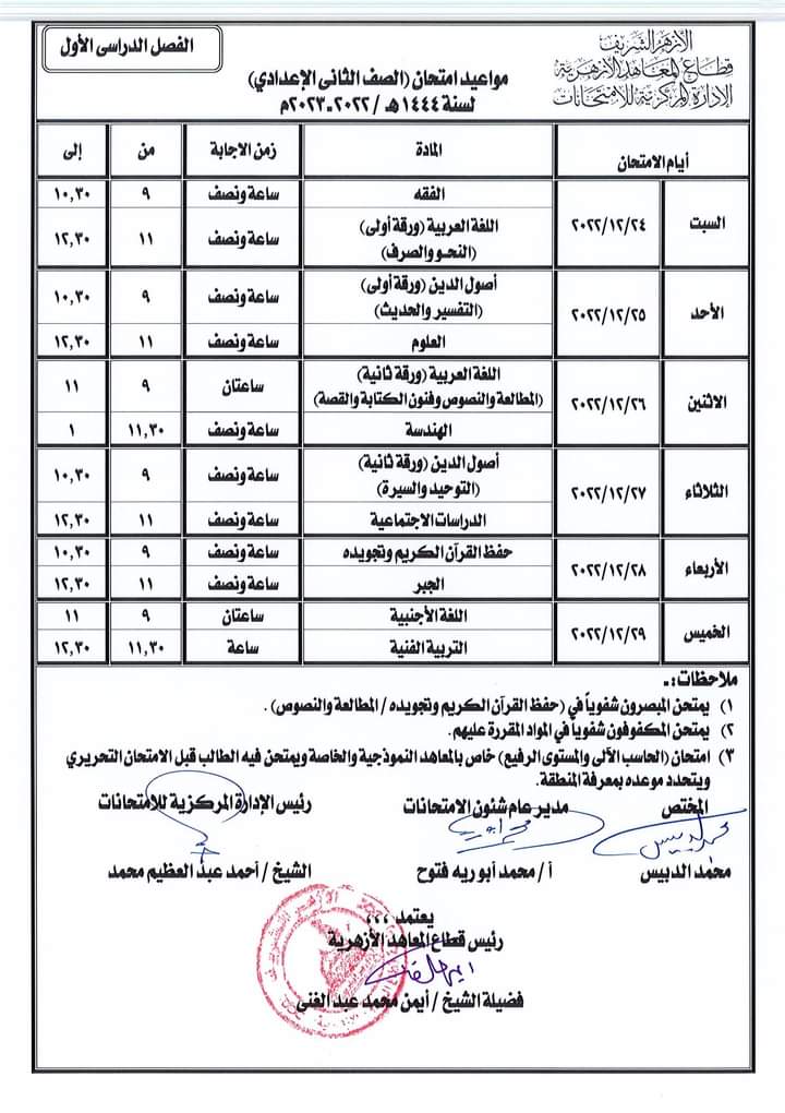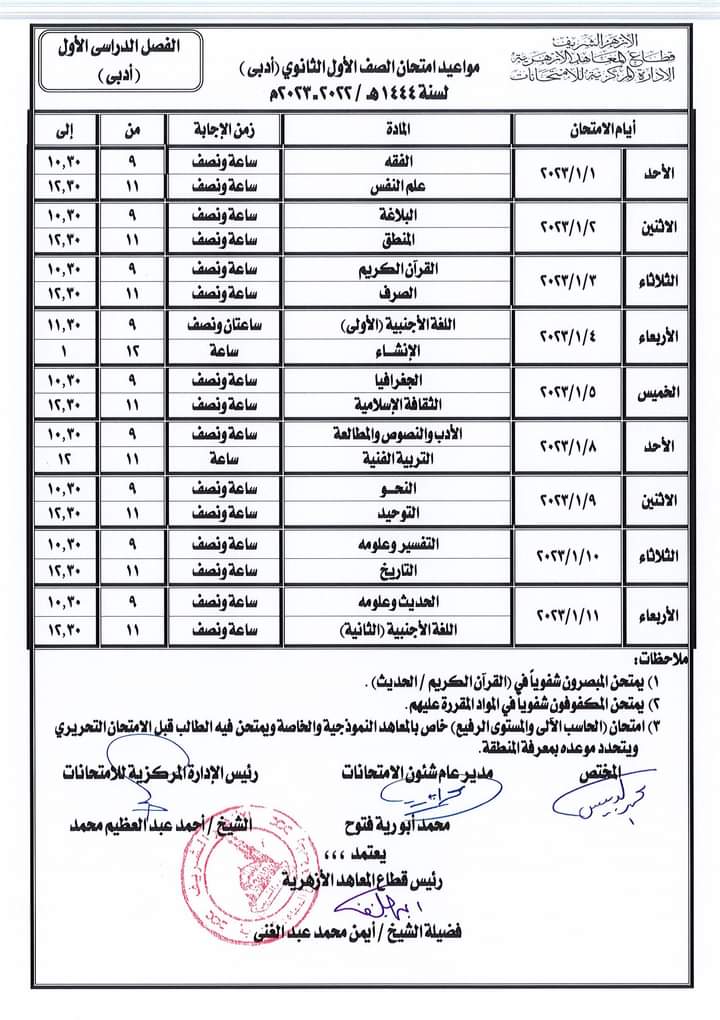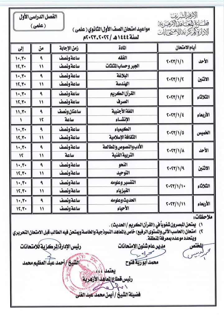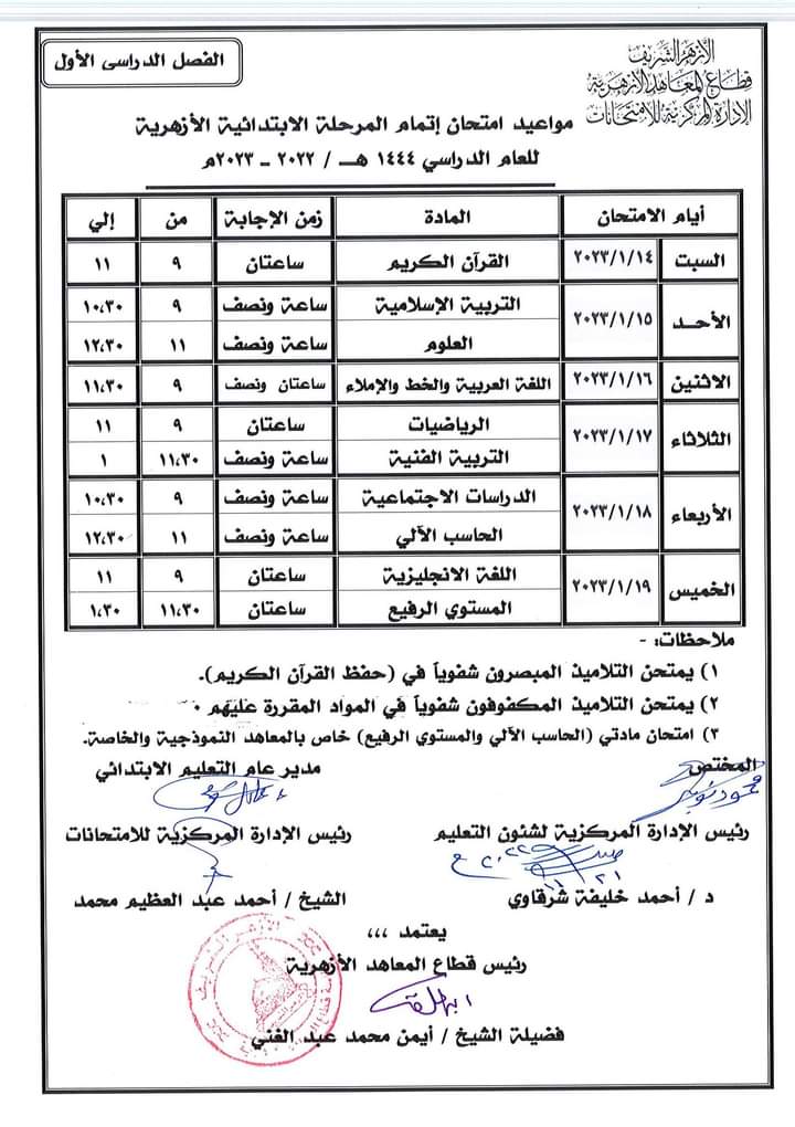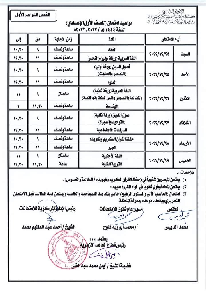 الجداول الكاملة لامتحانات الفصل الدراسي الأول في المعاهد الأزهرية | صور