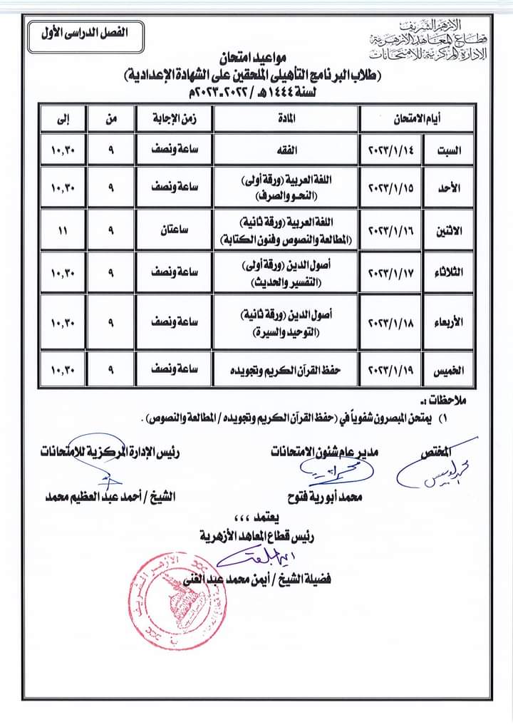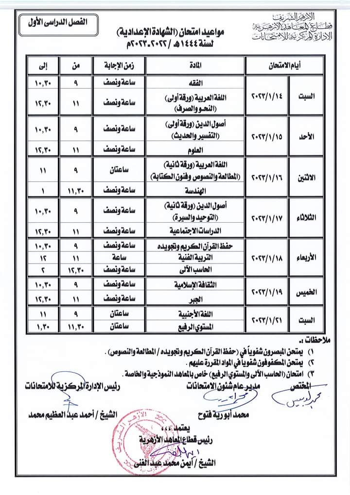 وتبدأ امتحانات الشهادة الإعدادية بالمعاهد الأزهرية يوم 14 يناير 2023.