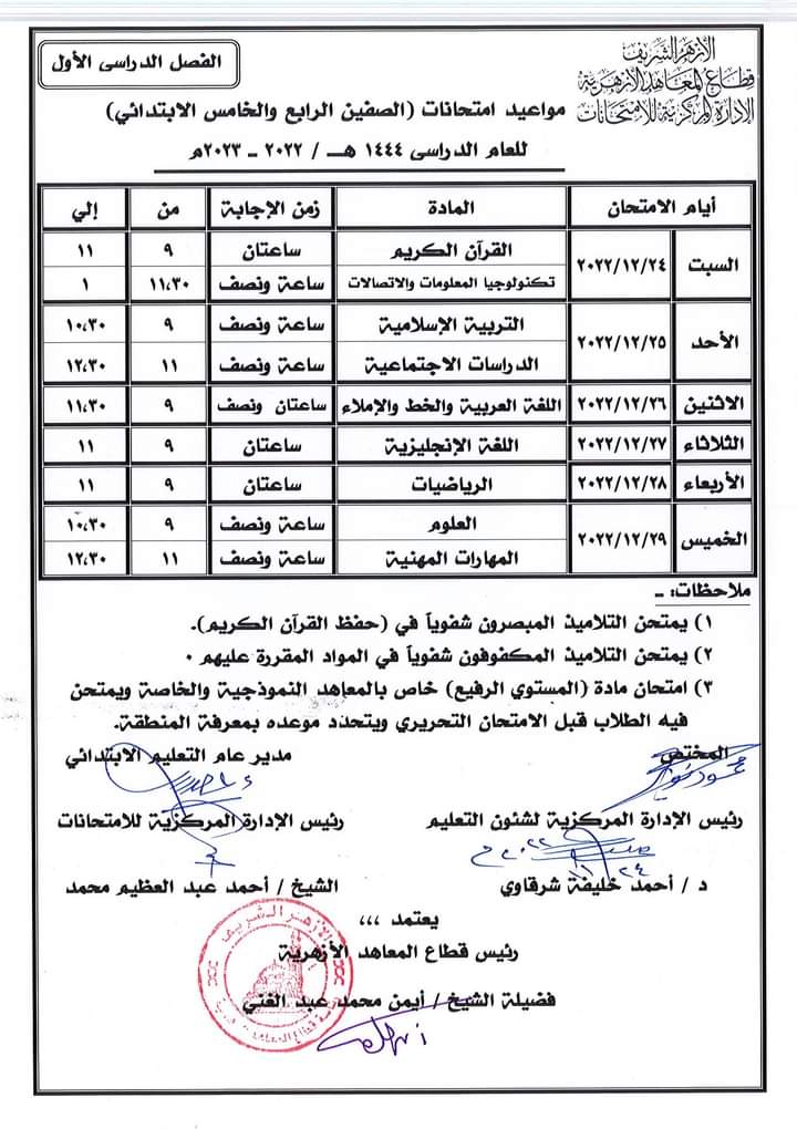 وتنطلق أولى امتحانات المعاهد الأزهرية للفصل الدراسي الأول يوم 24 ديسمبر الحالي بامتحانات الصفين الرابع والخامس الإبتدائي.