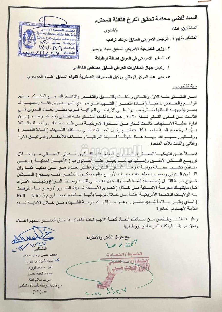وتضمنت الوثيقة دعوى قضائية للمطالبة بمحاسبة رئيس الولايات المتحدة الأمريكية السابق دونالد ترامب ووزير خارجيتها بومبيو وسفيرها لدى العراق وشخصيات عراقية وهي: مصطفى الكاظمي رئيس الوزراء السابق ومدير عام المركز الوطني ووكيل المخابرات العسكرية السابق ضياء الموسوي، على خلفية اغتيال المهندس ورفاقه عام 2020، حسبما نقل موقع السومرية.