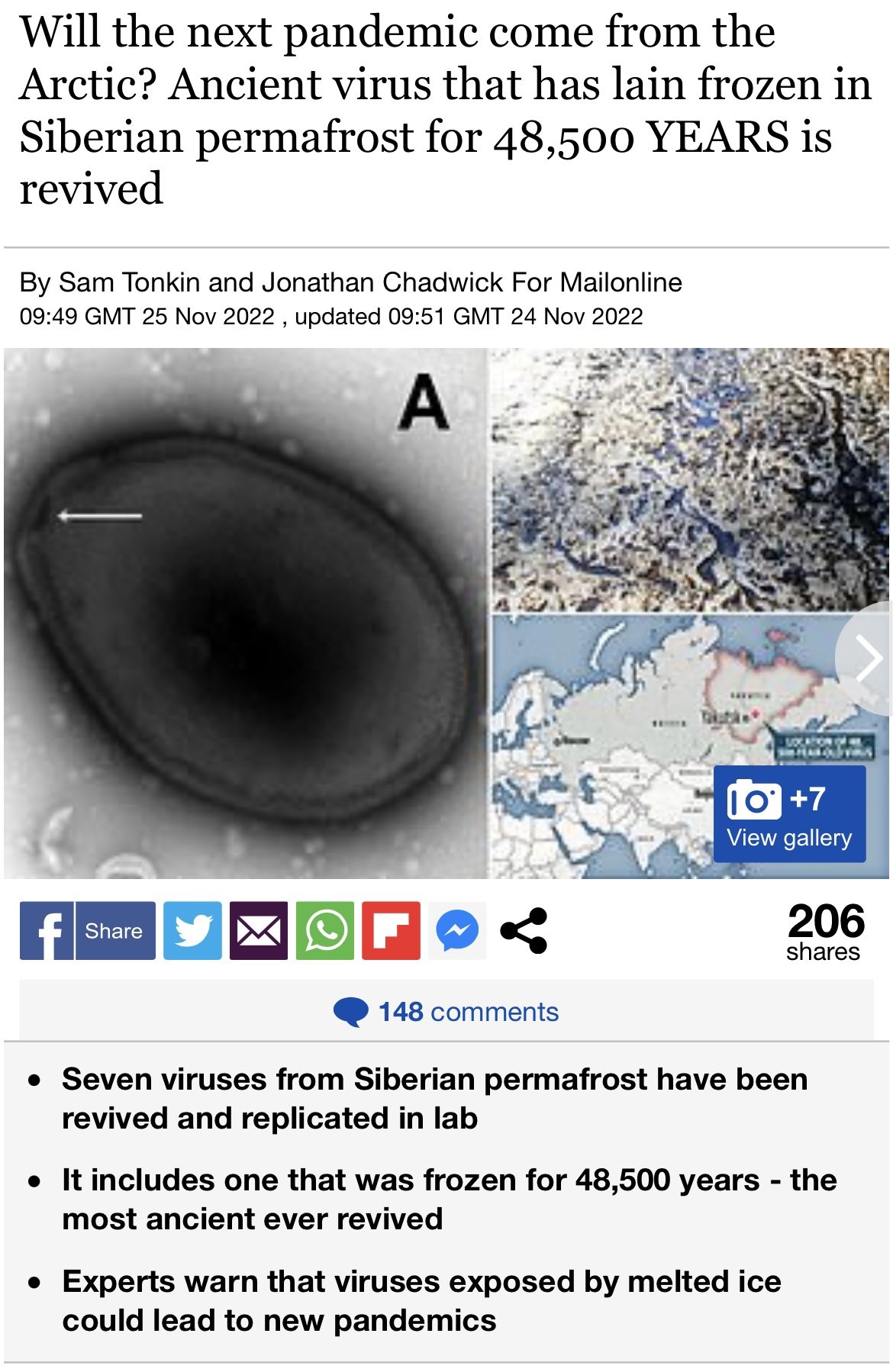 وعبر أحمد مبارك بشير عن مخاوفه قائلًا: "شافوا كورونا ما نفع للتخلص من البشر، راحوا يجيبوا وحوش من الماضي... علماء من فرنسا يعيدون تنشيط 7 فيروسات أقدمها كان خامل ومتجمد في ثلوج سيبيريا قرابة 50 ألف عام، يقول أحد العلماء إنهم سعيدون بهذا الإنجاز لأنه أقدم فيروس يتم تنشيطه في التاريخ. وخبراء يحذرون من أن هذه الفيروسات قد تكون بداية لأوبئة جديدة قد يعاني منها البشر في المستقبل."