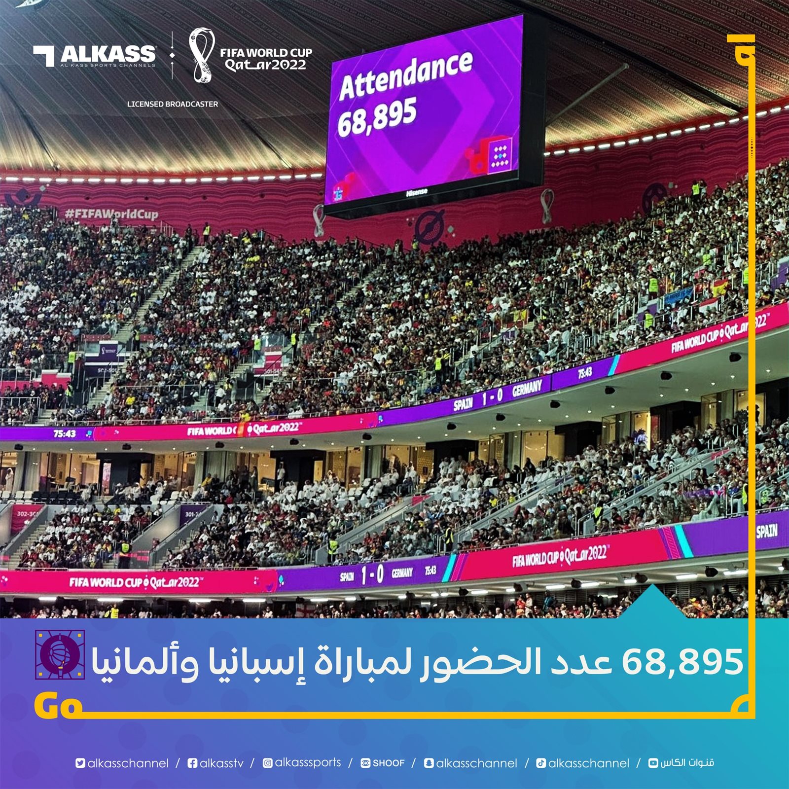 شهدت مباراة اسبانيا والمانيا حضور 68 ألفا و895 متفرجا لمتابعة المباراة الهامة ضمن الجولة الثانية لدور المجموعات ببطولة كأس العالم 2022.
