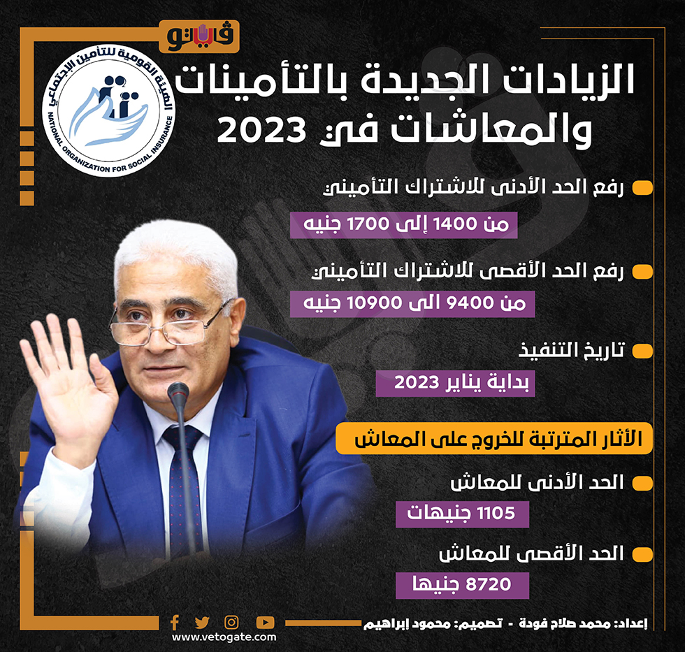 الزيادات الجديدة بالتأمينات والمعاشات في 2023|إنفوجراف الثلاثاء 29/نوفمبر/2022 - 06:37 م 11/29/2022 6:37:13 PM اللواء جمال عوض رئيس الهيئة القومية للتأمينات - محمد صلاح فودة شارك طباعة 18 حجم الخط شارك طباعة الحد الأدني للمعاش رفع المعاشات أموال صندوق المعاشات