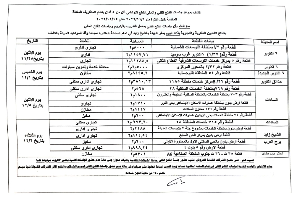 وجعلت الهيئة يوم الإثنين الموافق 5/12 لمدينة السدات لقطع الأراضي الآتية: