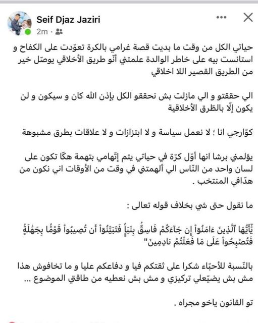 واختتم سيف الدين الجزيري تصريحاته قائلا: بالنّسبة للأحبّاء شكرا على ثقتكم فيا ودفاعكم عليا ولا تخافوا هذا لن يقلل تركيزي ولن أعطي الموضوع من وقتي وطاقتي والقانون سيأخذ مجراه، عيب والله”.