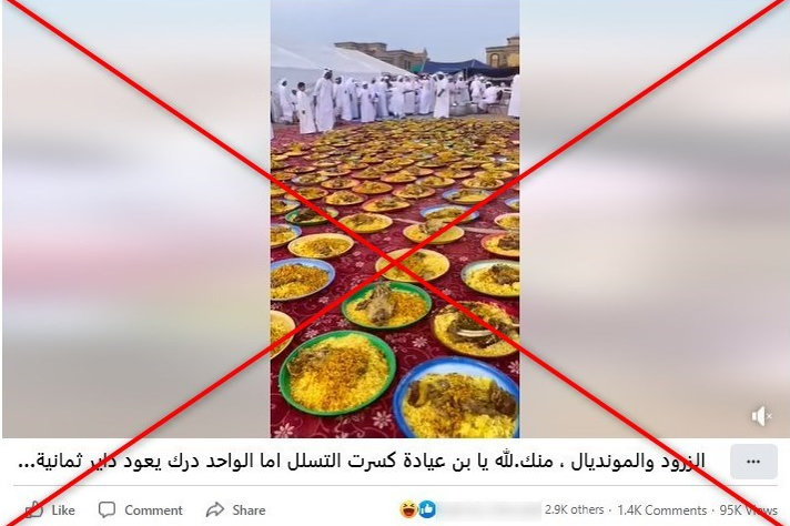ويظهر الفيديو عددًا من الرجال بملابس تقليديَّة يسكبون مئات أطباق الطعام من أوانٍ ضخمة.