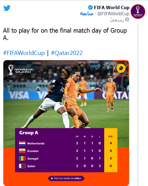 قدم منتخب السنغال عرضًا رائعًا أمام قطر صاحبة الأرض والجمهور وهزمها بنتيجة 3-1، ليحصد أول 3 نقاط وينعش آماله في العبور إلى ثمن النهائي، بينما اقتنصت الإكوادور نقطة من هولندا لترفع رصيدها إلى 4 نقاط.