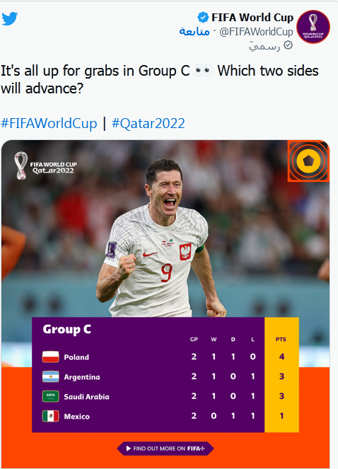 السعودية لديها 3 نقاط وتحتل المركز الثالث بفارق الأهداف عن الأرجنتين، بينما تتصدر بولندا برصيد 4 نقاط، ويحتاج الأخضر إلى الفوز للتأهل مباشرة أو التعادل مع فوز الأرجنتين على بولندا.
