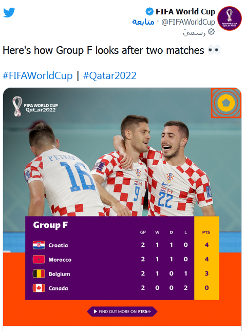 كرواتيا تتصدر المجموعة بفارق هدف واحد عن المغرب الثاني ولكل منهما 4 نقاط، بينما تأتي بلجيكا في المركز الثالث برصيد 3 نقاط، وتتذيل كندا بلا رصيد.