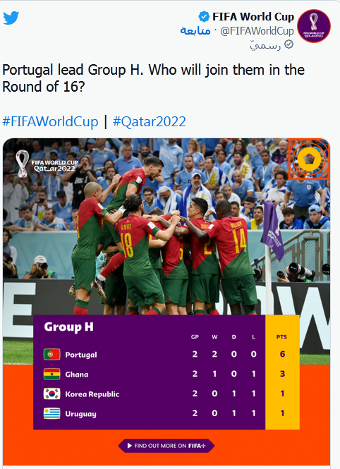غانا تحتل وصافة المجموعة الثامنة برصيد 3 نقاط خلف البرتغال المتصدرة برصيد 6 نقاط، بينما تتذيل أوروجواي المجموعة برصيد نقطة واحدة وبفارق الأهداف عن كوريا الجنوبية الثالث.