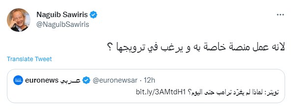 وكتب نجيب ساويرس تغريدة على تويتر قال فيها: "لأنه عمل منصة خاصة به ويرغب في ترويجها؟".
