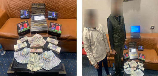 وبتفتيش المصنع فى حضورهما تم ضبط 102260 مائة واثنين ألف ومائتين وستين من أجهزة استقبال الإشارة وفك الشفرة والمستلزمات والأدوات والعدد المستخدمة للإنتاج والتصنيع والتعبئة والتغليف وملصقات مدون عليها رقم المسلسل الخاص بالأجهزة، واثنان جهاز حاسب آلى محمل عليهما برمجيات القرصنة وأكواد تشغيل سيرفرات المحتوي المقرصن ومبالغ مالية عملات أجنبية ومحلية، 3 هواتف محمولة وبفحصها تبين احتوائها على أدلة تُشير إلى نشاطهما غير المشروع.