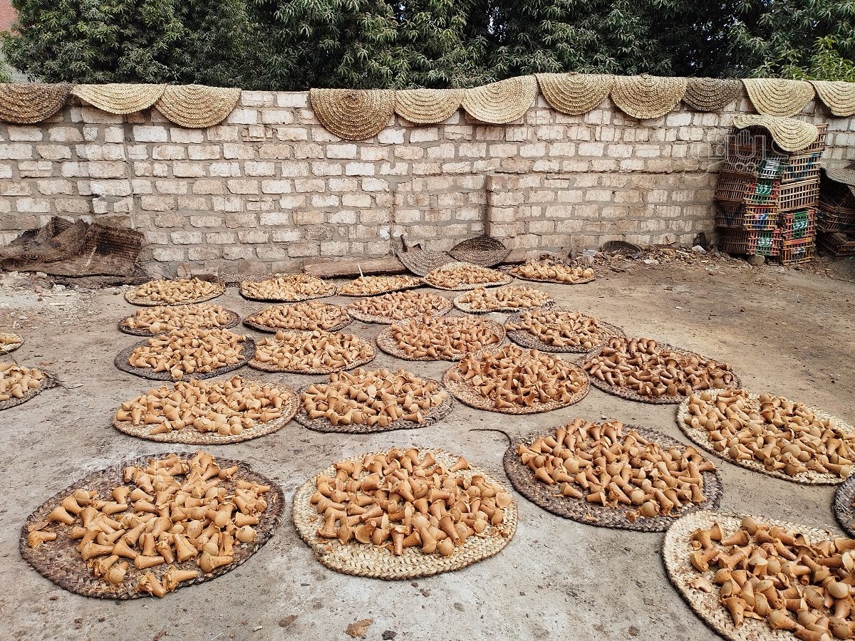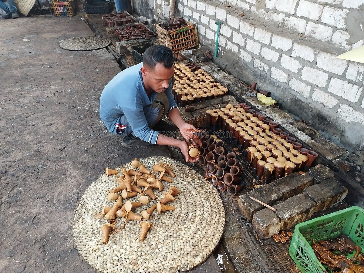 ونوه إلى أن هناك عددا من الأواني الفخارية يكون على شكل أقماع ويكون بها سدة خشبية، ونقوم بسكب الجلاب في تلك الأواني عقب الانتهاء من تنظيفها بشكل كبير من خلال أدوات مخصصة لهذا الأمر، وبعدها نبدأ في عملية التنشيف التي تكون بتفريغ الجلاب من تلك الأقماع ووضعها على أطباق من الخوص مخصصة لهذا الأمر تسمى “البرش”عقب الانتهاء من غسلها وتنشيفها في الشمس.