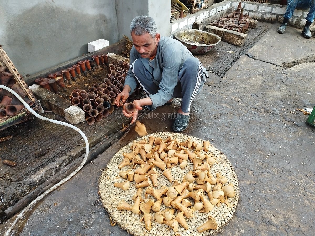 وقال محمد صبري، “مخلع جلاب” هذا هو عملي داخل المصنع فخلع الجلاب من الفخار يكون بطريقة معينة حتى لا يخرج الجلاب في أشكال غير متساوية ويصبح غير شكل القمع.