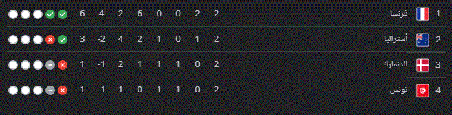وخرج المنتخب الفرنسي من حسابات المجموعة حيث يتصدر الديوك المجموعة وضمن التأهل رسميا الصعود إلى دور الـ 16 ويواجه منتخب تونس في الجولة الأخيرة الذي يحتاج الفوز ولا بديل عنه مع تعادل أستراليا والدنمارك.