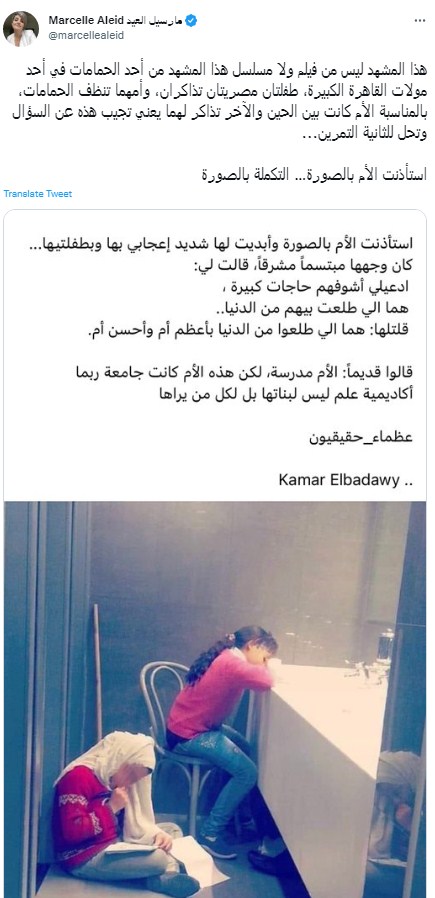 وعلقت مارسيل العيد قائلة: "هذا المشهد ليس من فيلم ولا مسلسل هذا المشهد من أحد الحمامات في أحد مولات القاهرة الكبيرة، طفلتان مصريتان تذاكران، وأمهما تنظف الحمامات، بالمناسبة الأم كانت بين الحين والآخر تذاكر لهما يعني تجيب هذه عن السؤال وتحل للثانية التمرين...".