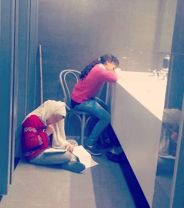 وكانت إحدى السيدات وتدعى قمر البدوي قد نشرت صورة لطفلتين تذاكران دروسهما في حمام أحد المولات في القاهرة، ومتبت تدوينة عبر صفحتها بالفيس بوك، عبرت فيها عن تأثرها فقالت: "هذا المشهد ليس من فيلم ولا مسلسل هذا المشهد من أحد الحمامات في أحد مولات القاهرة الكبيرة، طفلتان مصريتان تذاكران، وأمهما تنظف الحمامات، بالمناسبة الأم كانت بين الحين والآخر تذاكر لهما يعني تجيب هذه عن السؤال وتحل للثانية التمرين... استأذنت الأم بالصورة وأبديت لها شديد إعجابي بها وبطفلتيها... كان وجهها مبتسمًا مشرقًا، قالت لي: ادعيلي أشوفهم حاجات كبيرة، هما الي طلعت بيهم من الدنيا.. قلتلها: هما الي طلعوا من الدنيا بأعظم أم وأحسن أم. قالوا قديمًا: الأم مدرسة، لكن هذه الأم كانت جامعة ربما أكاديمية علم ليس لبناتها بل لكل من يراها عظماء_حقيقيون".