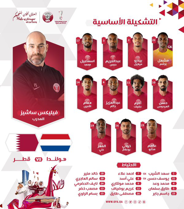 أعلن فيليكس ساشيز المدير الفني للمنتخب القطري عن تشكيل الفريق لمواجهة منتخب هولندا بالجولة الثالثة بدور المجموعات ببطولة كأس العالم قطر 2022.