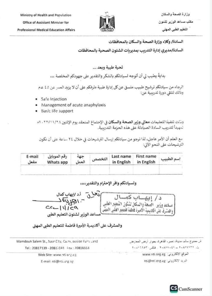 أصدر الدكتور إيهاب كمال، مساعد وزير الصحة للتدريب، منشورا دوريا لكل المحافظات بشأن ترشيح طبيب منسق عن كل إدارة صحية، وألا يزيد عمره على ٤٥ سنة لتلقي دورات تدريبية عن الحقن الآمن والإسعافات الأولية لإنقاذ المرضى في حالات الطوارئ، وذلك تنفيذا لتعليمات وزير الصحة تمهيدا لتدريب الصيادلة علي ذلك.
