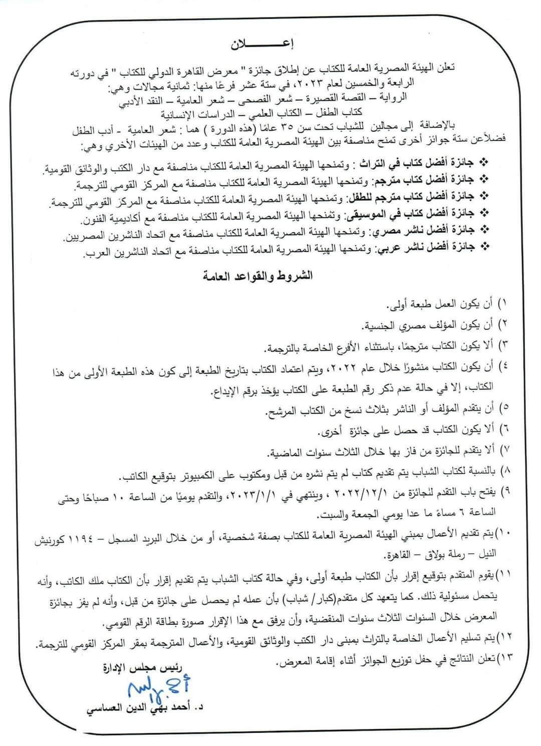 أعلنت الهيئة المصرية العامة للكتاب عن إطلاق جوائز "معرض القاهرة الدولى للكتاب" فى دورته الرابعة والخمسين لعام 2023، فى ستة عشر فرعًا منها: ثمانية مجالات وهي: