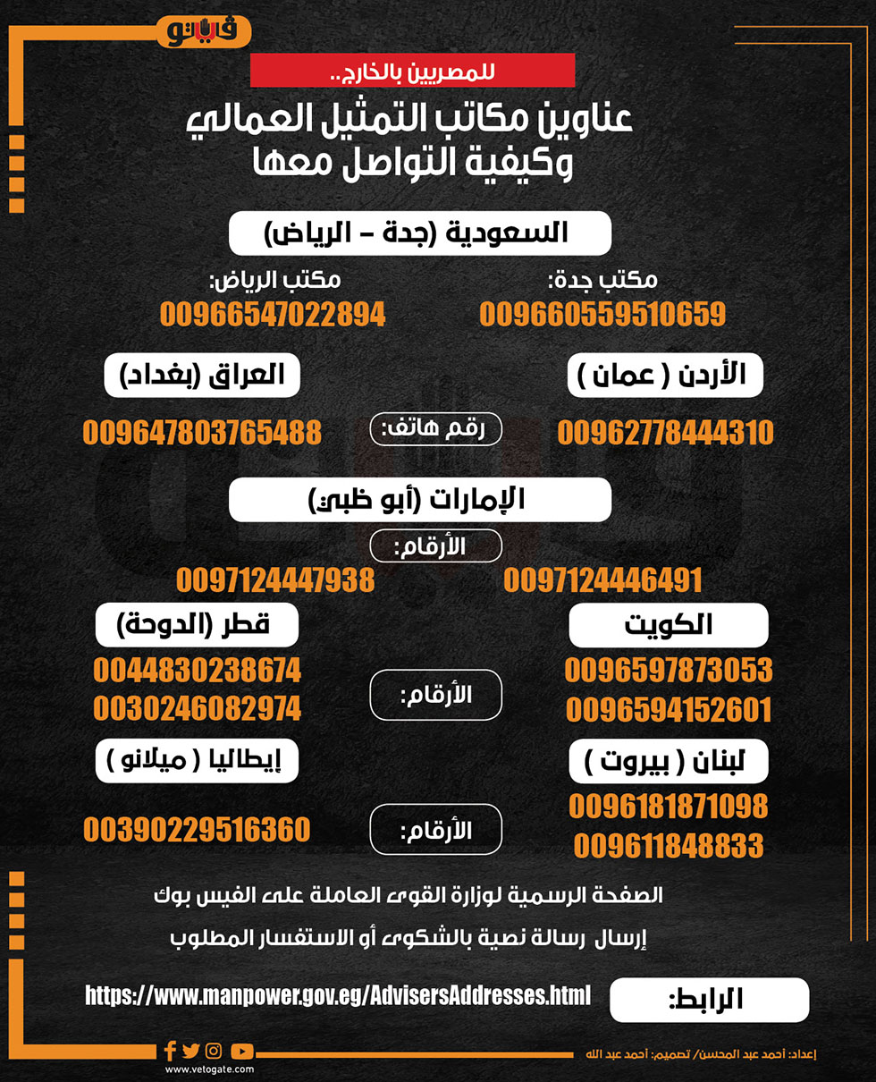 للمصريين بالخارج.. عناوين مكاتب التمثيل العمالي وكيفية التواصل معها | انفوجراف الأربعاء 30/نوفمبر/2022 - 02:10 م 11/30/2022 2:10:35 PM السفارة المصرية أحمد عبدالمحسن شارك طباعة 18 حجم الخط شارك طباعة التمثيل العمالي القوى العاملة وزارة القوى العاملة مكاتب التمثيل العمالي مكاتب التمثيل السعودية