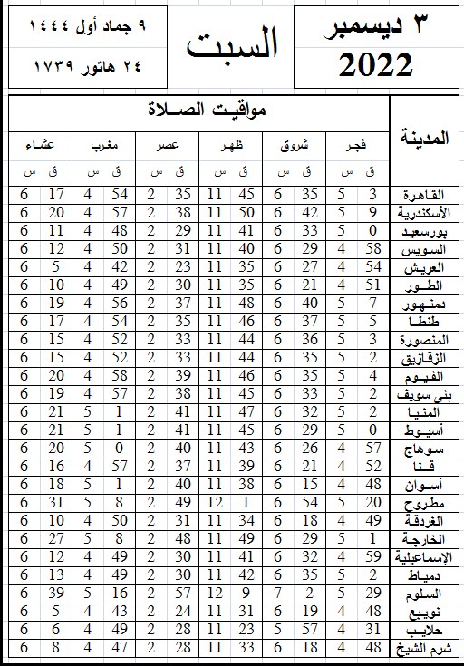 مواقيت الصلاة اليوم وفقًا للتوقيت المحلي لمدينتي القاهرة والإسكندرية وعدد من مدن ومحافظات الجمهورية من واقع بيانات الهيئة العامة للمساحة