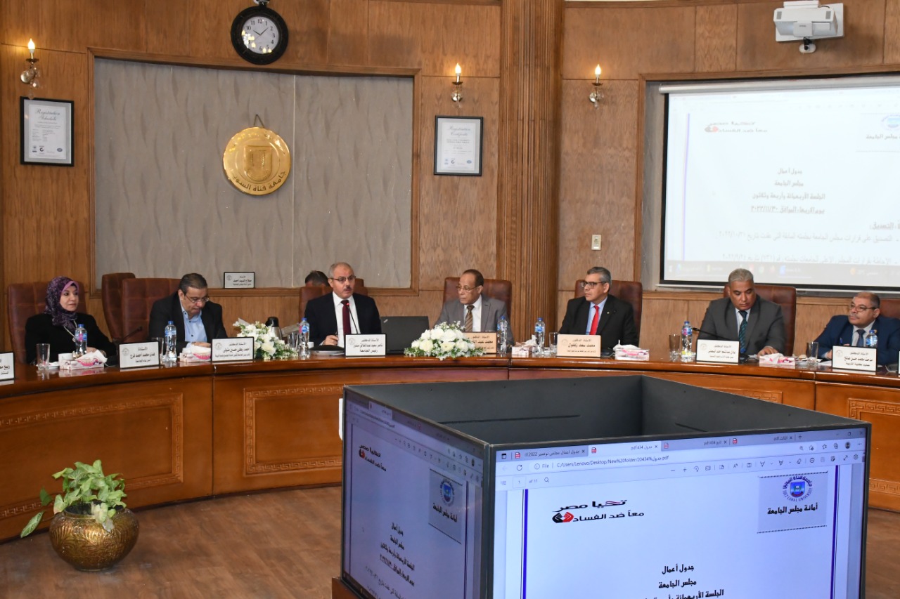 جاء ذلك أثناء اجتماع مجلس جامعة قناة السويس برئاسة الدكتور ناصر مندور رئيس الجامعة وبمشاركة الدكتور أحمد زكى نائب رئيس الجامعة لشئون خدمة المجتمع وتنمية البيئة والدكتور محمد عبد النعيم نائب رئيس الجامعة لشئون التعليم والطلاب والدكتور محمد سعد زغلول نائب رئيس الجامعة لشئون الدراسات العليا والبحوث وهدى فرج أمين عام الجامعة وعمداء الكليات.