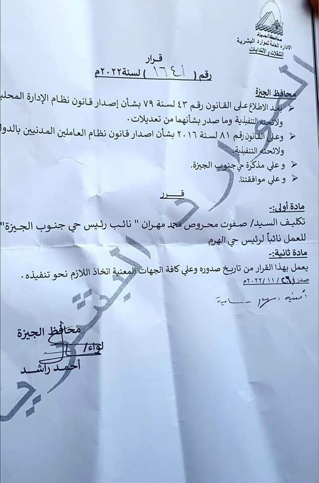 تعيين صفوت محروس نائب رئيس حي الهرم| مستند