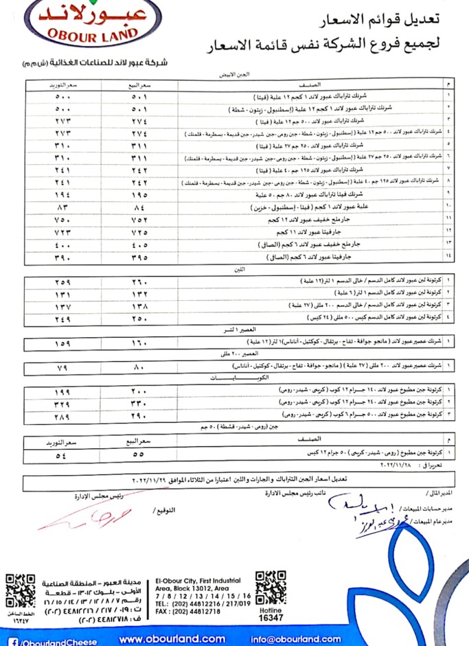 أعلنت شعبة المواد الغذائية بغرفة الجيزة التجارية عن قرار شركة عبور لاند للألبان برفع أسعارها في الأسواق.