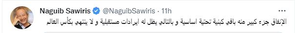 وكتب "ساويرس" قائلًا: "الإنفاق جزء كبير منه باقي كبنية تحتية أساسية وبالتالي يظل له إيرادات مستقبلية ولا ينتهي بكأس العالم".
