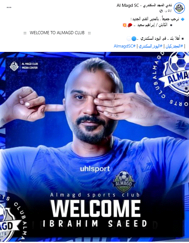 وأعلن النادي عبر حسابه عبر “فيس بوك”: نرحب جميعًا ،بالمدير الفني الجديد إبراهيم سعيد