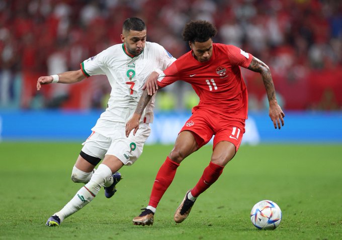 سجل هدفي المغرب: حكيم زياش في الدقيقة 4، يوسف النصيري في الدقيقة 23، بينما سجل نايف أكرد بالخطأ في مرماه هدف كندا في الدقيقة 40.