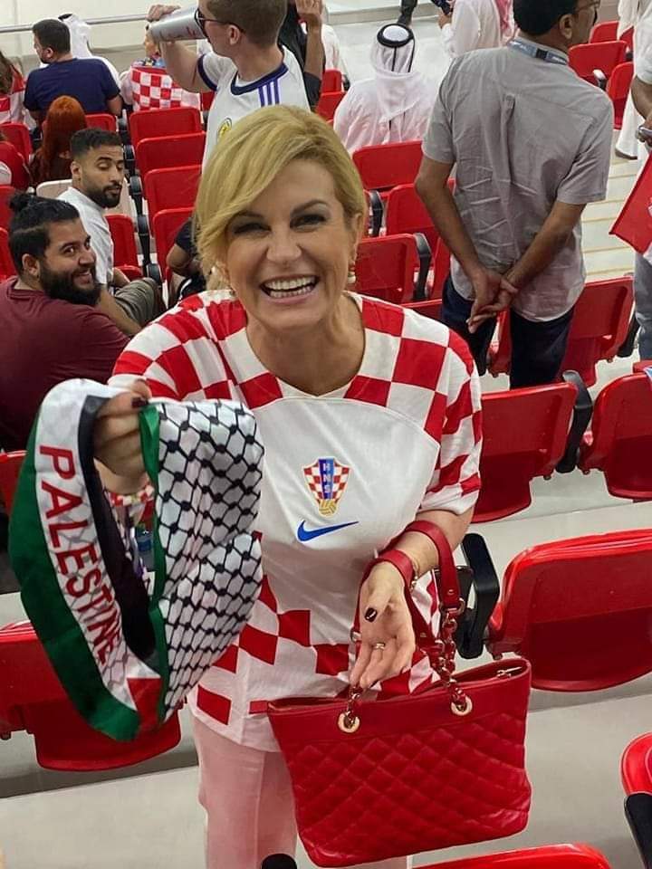 وظهرت رئيسة وزراء كرواتيا في مدرجات مباراة كرواتيا وبلجيكا وهي تلتقط صورا بالعلم الفلسطيني.