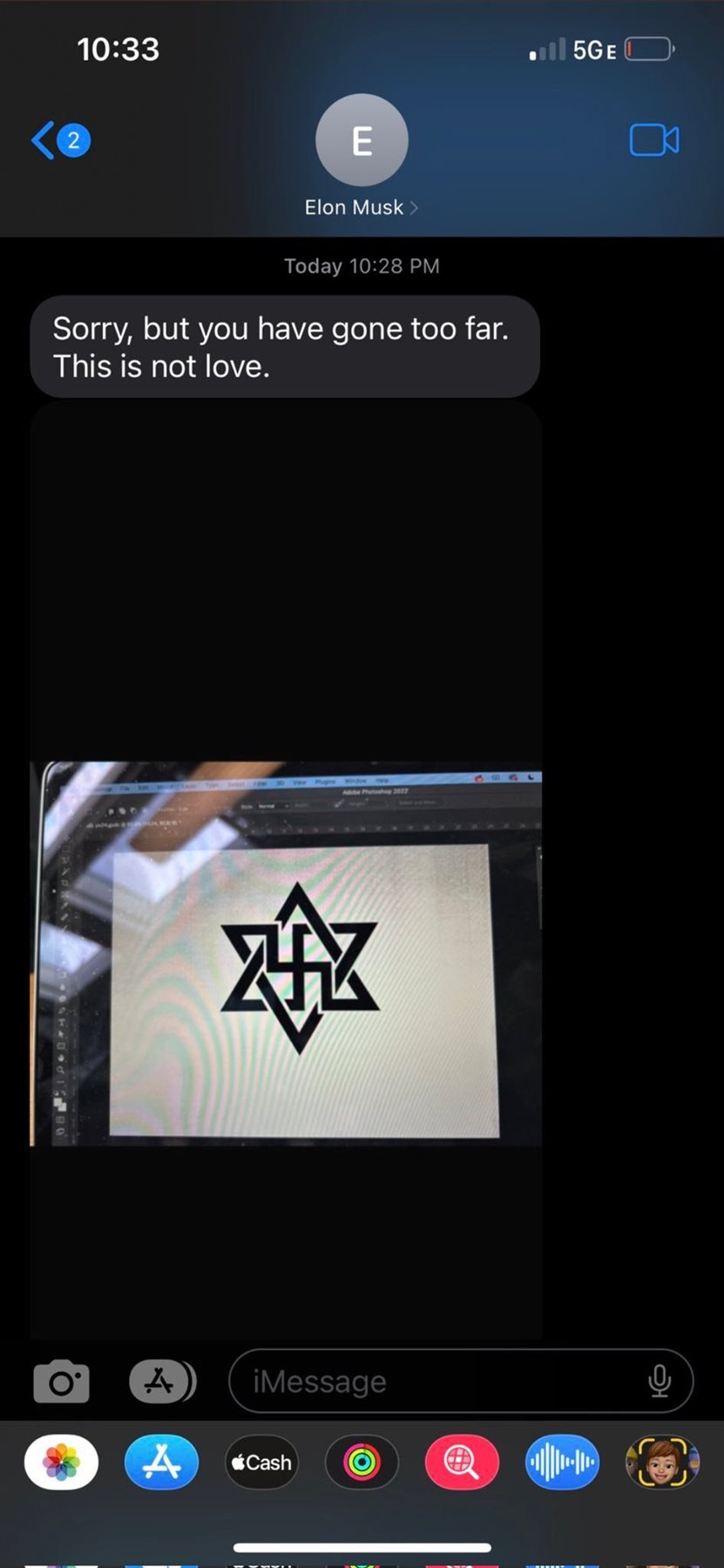 فيما كشف كانييه ويست أن إيلون ماسك، مالك موقع “تويتر”، أرسل له رسالة نصية عبر هاتفه يعتذر فيها عن إيقاف حسابه قائلا "آسف لكنك تعديت حدودك".