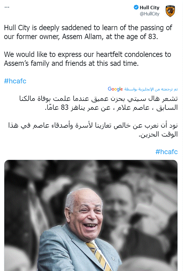 وأعرب نادي هال سيتي في بيان رسمي عن حزنه العميق بعد إعلان خبر وفاة مالكه السابق عاصم علام.