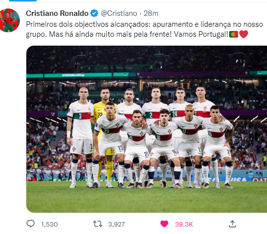غرد نجم منتخب البرتغال كريستيانو رونالدو على صفحته الشخصية تويتر قائلا: جاهزون تماما للمرحلة القادمة من كأس العالم قطر 2022.