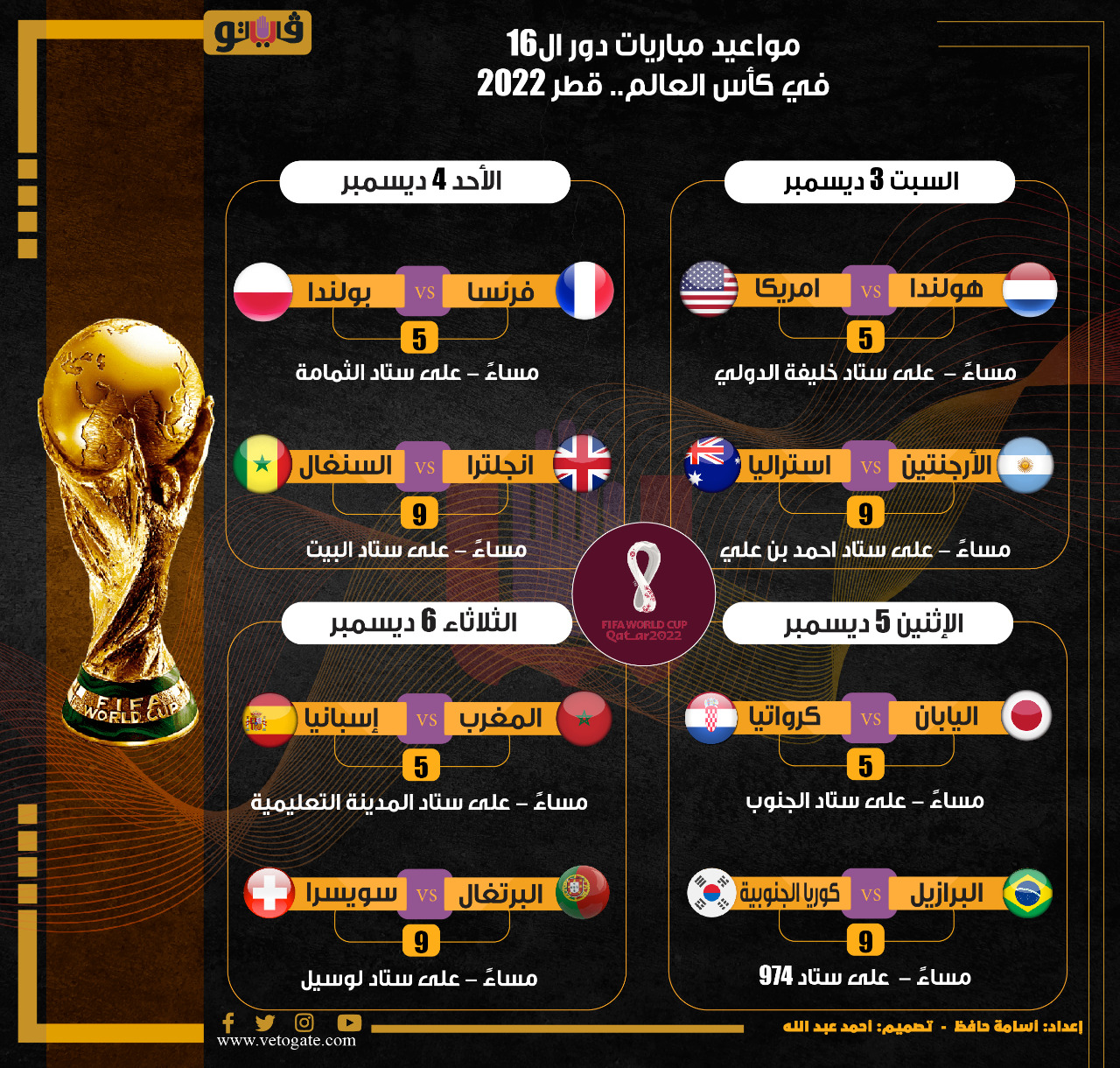 مواعيد مباريات دور الـ16 في كأس العالم قطر 2022| إنفوجراف الجمعة 02/ديسمبر/2022 - 11:23 م 12/2/2022 11:23:55 PM مواعيد مباريات دور الـ16 في كأس العالم قطر 2022 شارك طباعة 18 حجم الخط شارك طباعة