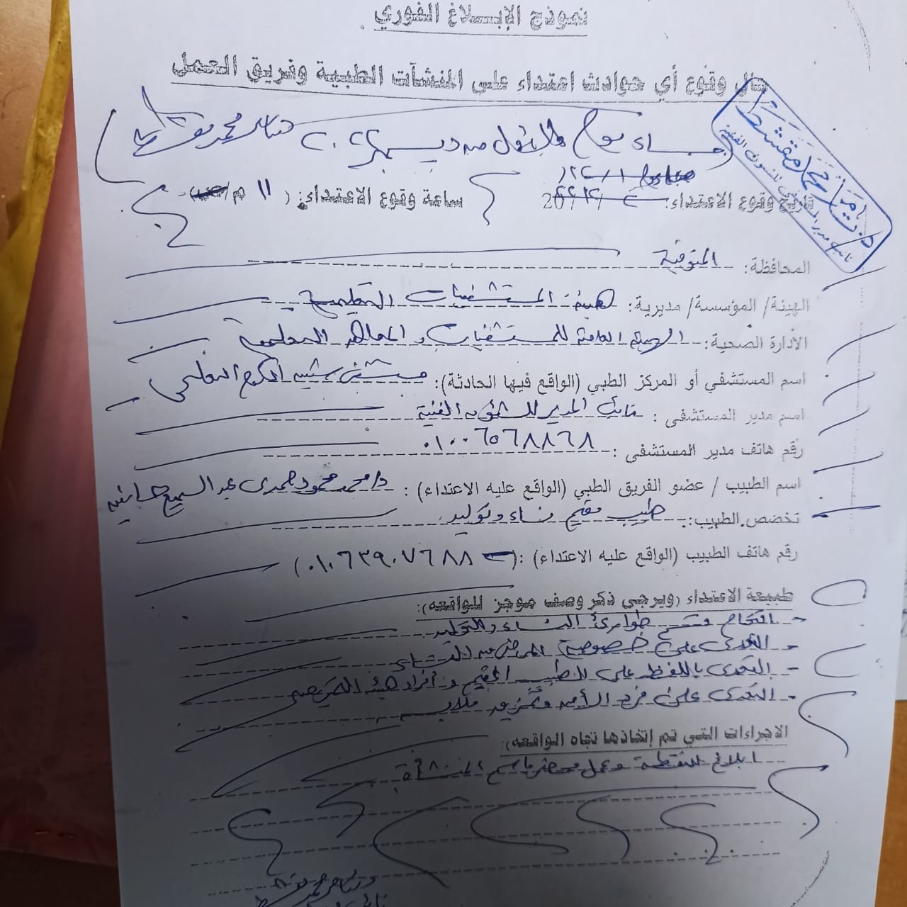 وتضمن النموذج أن المستشفى قامت بتحرير محضر رسمى بإسم المنشأة الطبية واثبات الاعتداء على الأفراد وقدمت التقارير الطبية الخاصة بالمعتدى عليهم.
