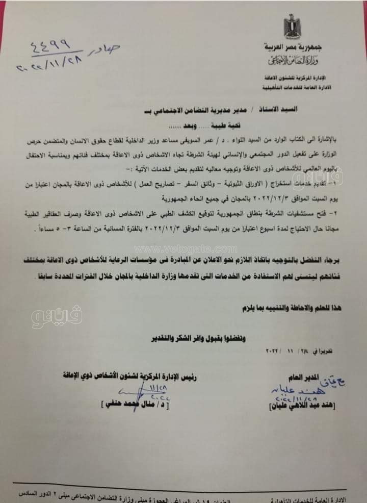 وحصلت “فيتو”على مستند عن مخاطبات وزارة الداخلية برئاسة اللواء دكتور عمر السويفي مساعد وزير الداخلية لقطاع حقوق الإنسان والمتضمن السماح بالخدمات المجانية لذوي الإعاقة واخطار وزارة التضامن الاجتماعى بشأنها.