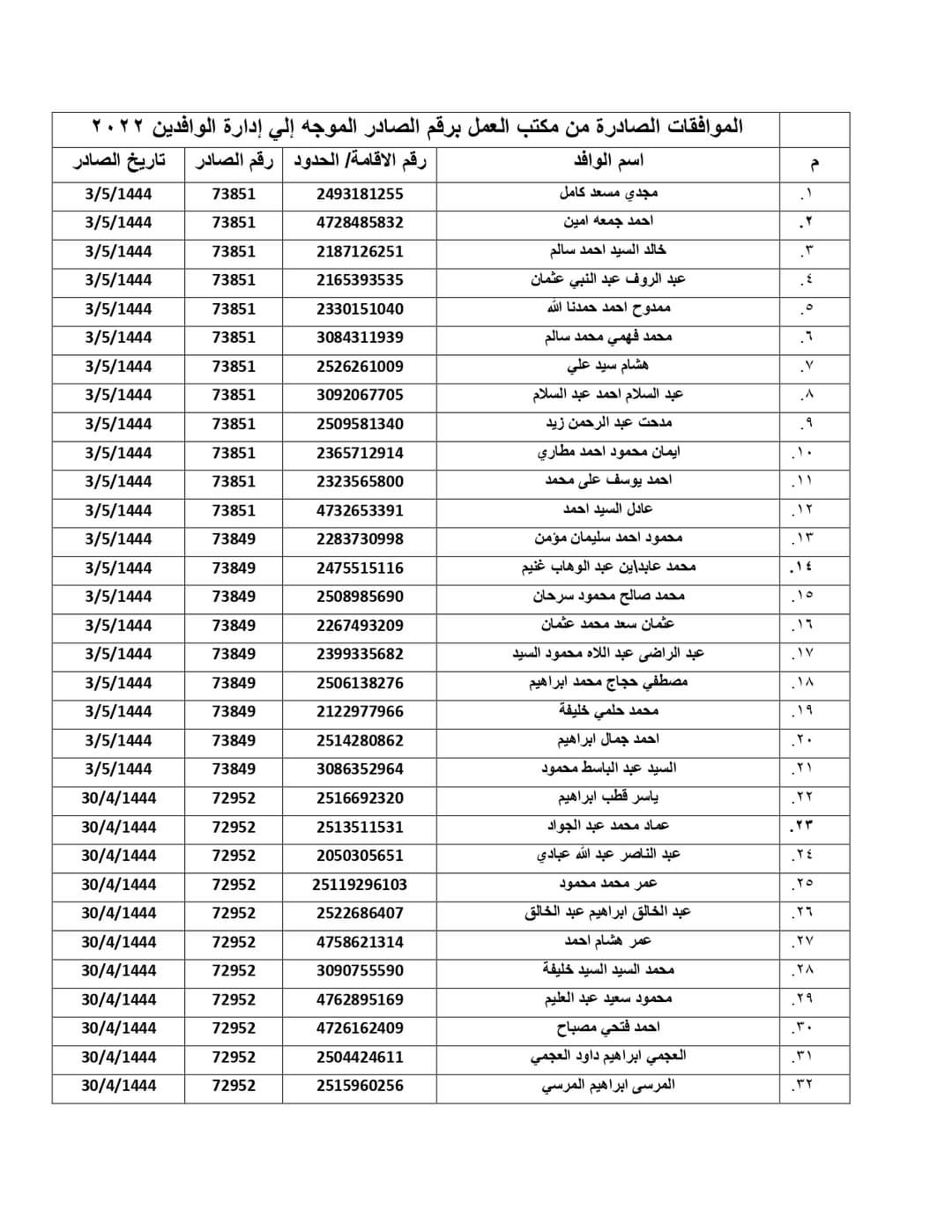 أعلنت وزارة القوى العاملة وبالأسماء،اليوم الأحد عن قيام مكتب التمثيل العمالي التابع لها بالرياض تلقى 87 طلبا للخروج النهائي للعاملين المصريين الذين انتهت إقامتهم ولم يتم تجديدها وأًصبحوا مخالفين لنظام الإقامة، وعليه قام المكتب بمخاطبة إدارة الوافدين بالرياض الذي أفاد بالموافقة على حصول 45 عاملًا مصريًا من المخالفين لنظام الإقامة والعمل في المملكة العربية السعودية،على تأشيرات للعودة إلى مصر، فيما تم رفض 21 طلب لوجود ملاحظات تمنعهم من الخروج النهائي.