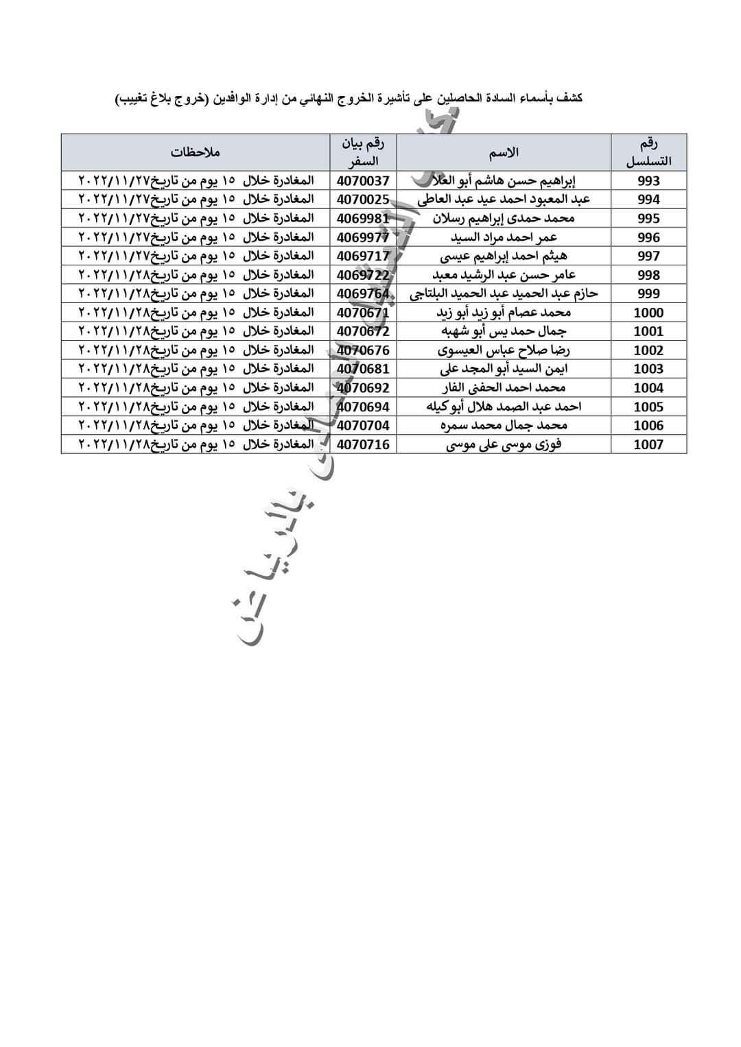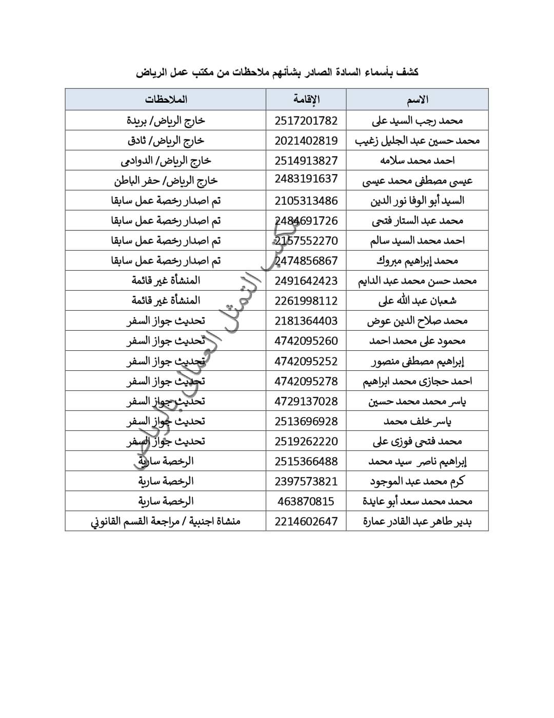 وجاء في التقرير الذي تلقاه وزير القوى العاملة حسن شحاتة،من أحمد رجائي الملحق العمالي ورئيس مكتب التمثيل العمالي بسفارة جمهورية مصر العربية بالرياض،أن القائمة تضم: 15 تأشيرة خروج نهائي وإبعاد لمن لديهم بلاغات غياب عن العمل،وهؤلاء لا يمكنهم العودة للسعودية مرة أخرى الا بعد مرور 5 سنوات،و 6 تأشيرات خروج نهائي نظامي،وهؤلاء ممن انتهت إقامتهم،ولم يقوم صاحب العمل بالتجديد لهم،ويحق لهم العودة للعمل بالسعودية بعد الحصول على تأشيرة جديدة،وطالبهم المكتب بتسديد المخالفات الخاصة بهم تمهيدًا لإستخراج تأشيرات عودة لهم.