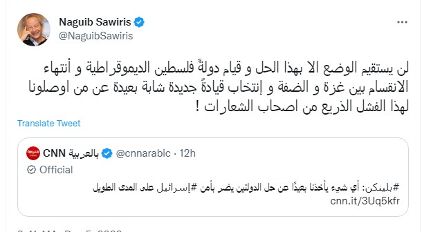 وكتب نجيب ساويرس تغريدة على تويتر قال فيها: "لن يستقيم الوضع إلا بهذا الحل وقيام دولةً فلسطين الديمقراطية وانتهاء الانقسام بين غزة والضفة وانتخاب قيادةً جديدة شابة بعيدة عن من أوصلونا لهذا الفشل الذريع من أصحاب الشعارات!".