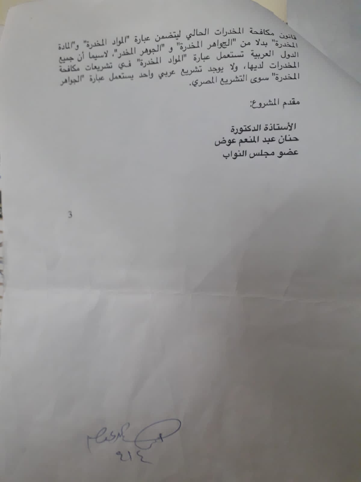 وفي هذا الصدد ووفقا لمشروع القانون، لاحظ المستشار محمد محمود خلف، وكيل هيئة قضايا الدولة، أن عبارة "الجواهر المخدرة" خاطئة من الناحية اللغوية، ويجب أن تستعمل بدلا منها عبارة "المواد المخدرة"، وأرسل بحثه في هذا الشأن إلى مجمع اللغة العربية.