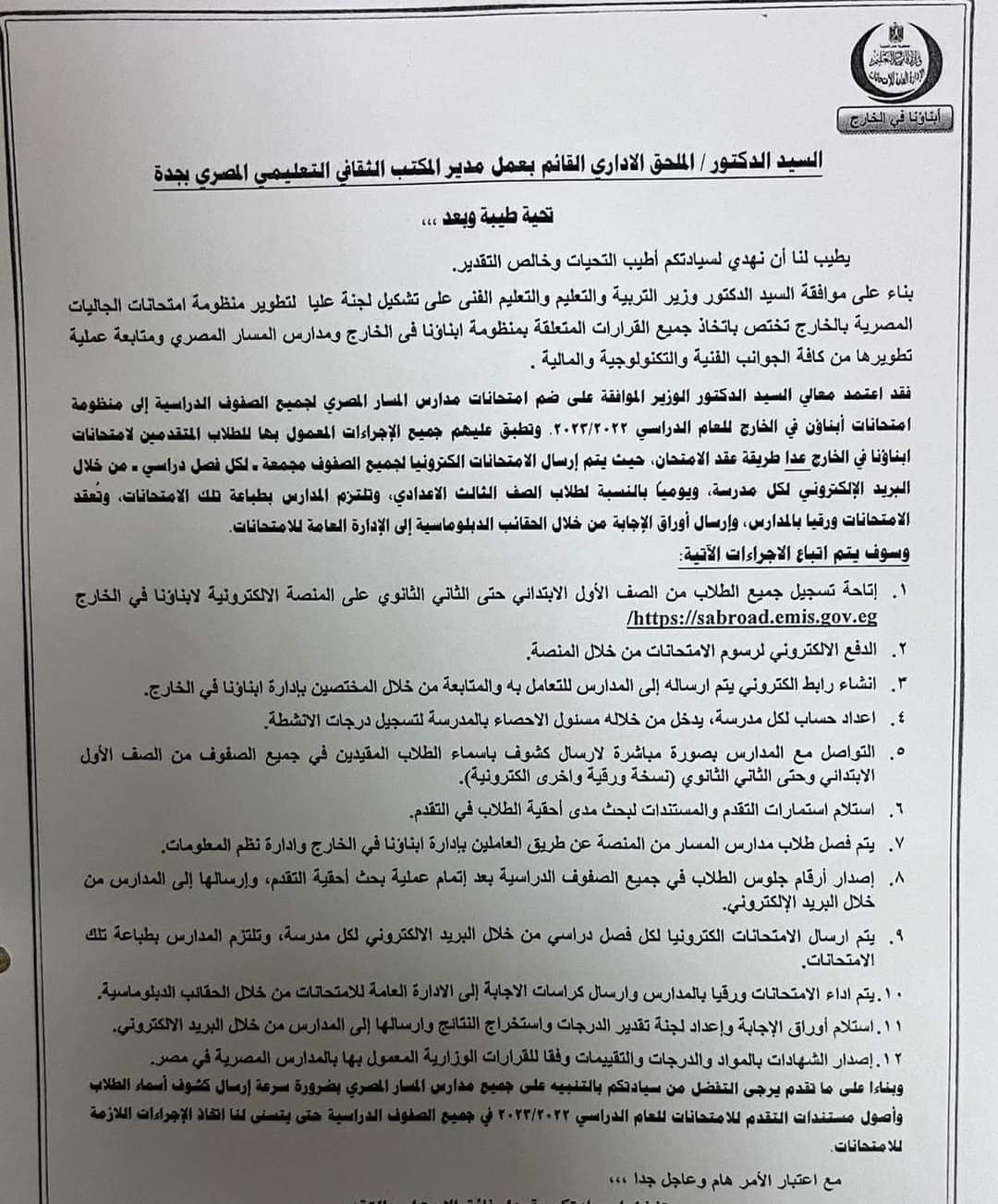 - سرعة إرسال كشوف أسماء الطلاب وأصول مستندات التقدم للامتحانات للعام الدراسي ۲۰۲۳/۲۰۲۲ في جميع الصفوف الدراسية حتى يتسنى لنا إتخاذ الإجرارات اللازمة للامتحانات.