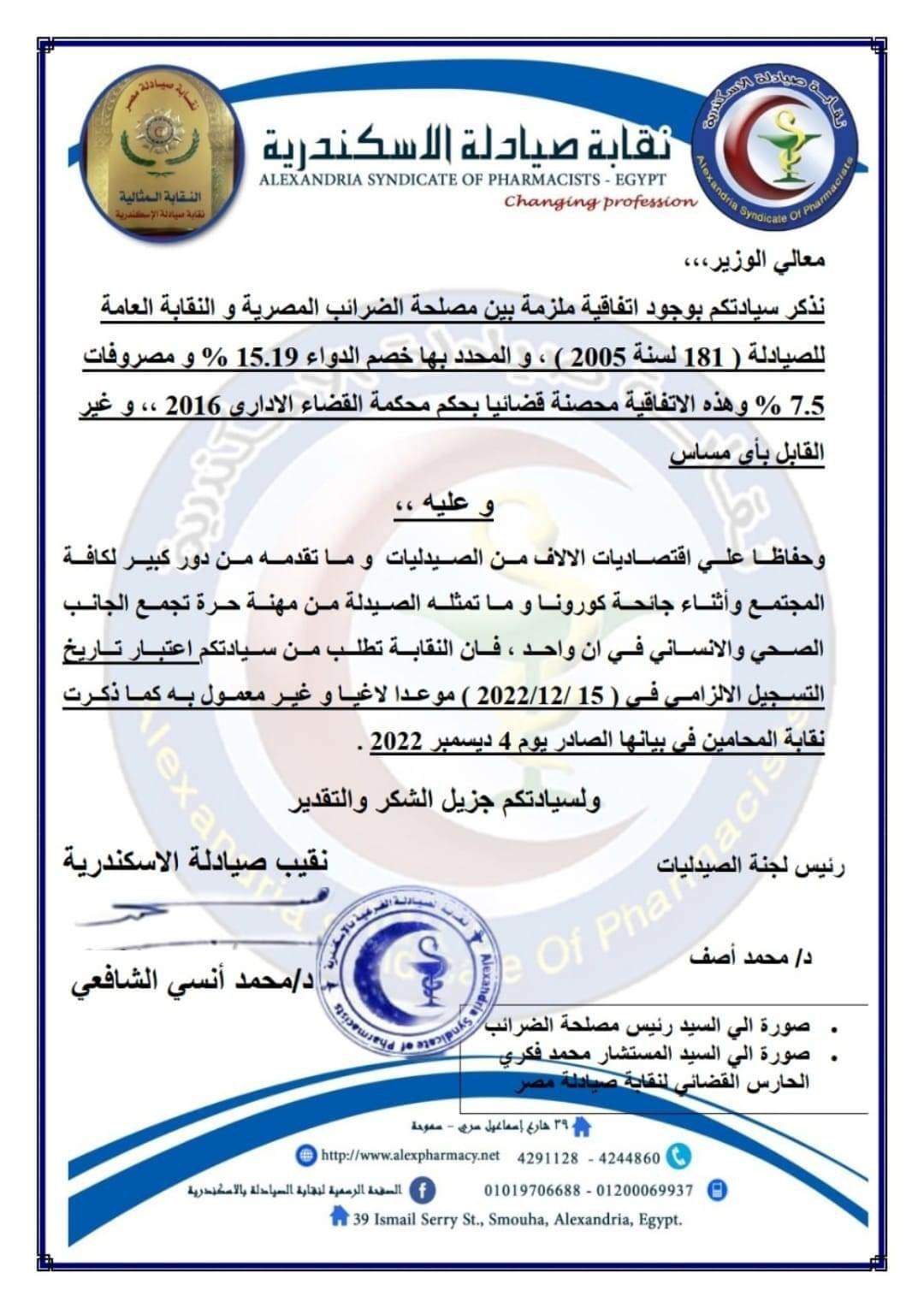 ووجهت النقابة الفرعية بالإسكندرية صورة من البيان إلى رئيس مصلحة الضرائب، والمستشار محمد فكري الحارس القضائي لنقابة صيادلة مصر.