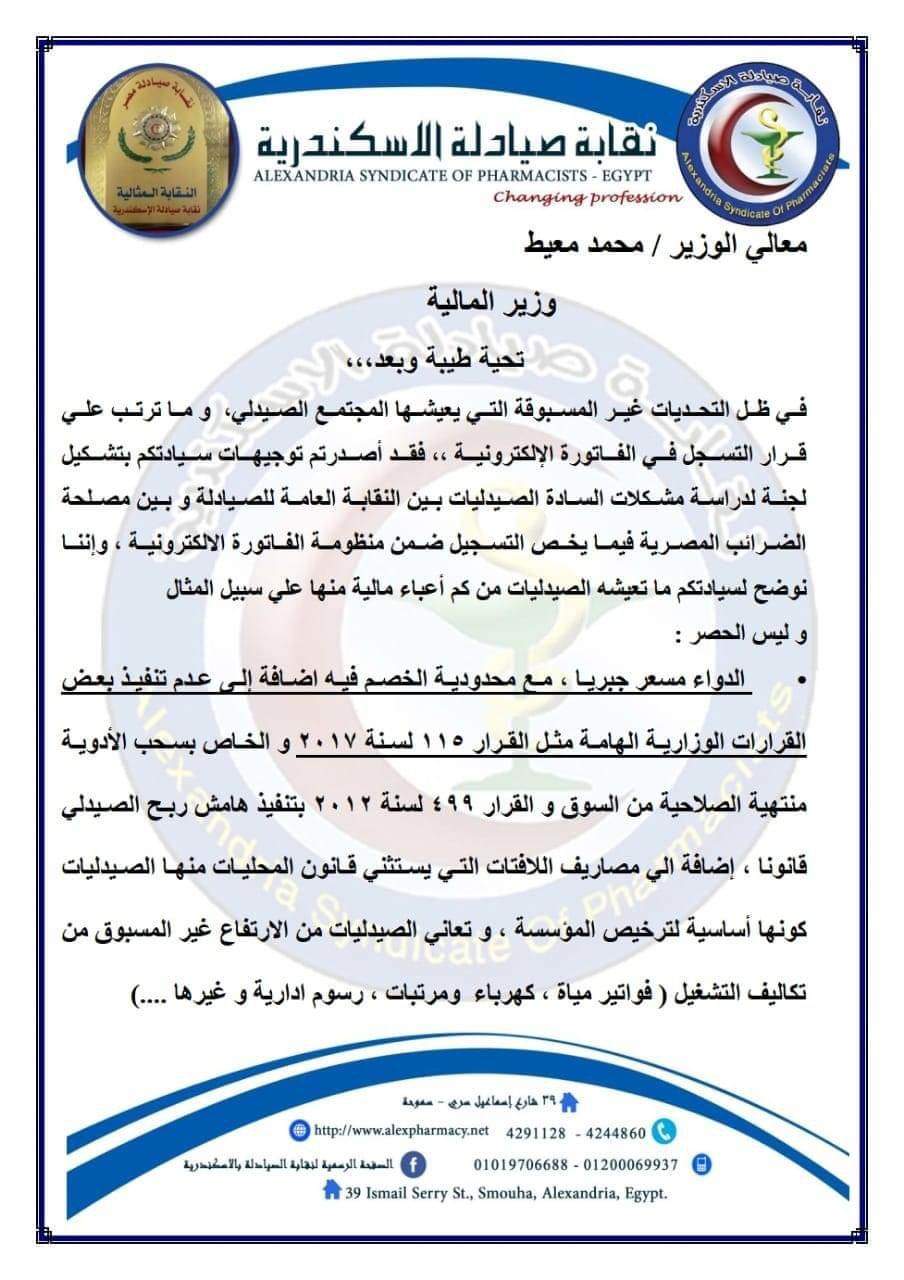 أصدرت نقابة صيادلة الإسكندرية برئاسة الدكتور محمد الشافعي، بيانا تخاطب فيه وزير المالية محمد معيط لمطالبته، باعتبار تاريخ التسجيل الإلزامي والتسجيل فى الفاتورة الإلكترونية في 15 ديسمبر الجاري موعدًا ملغى وغير معمول، أسوة بنقابة المحامين.