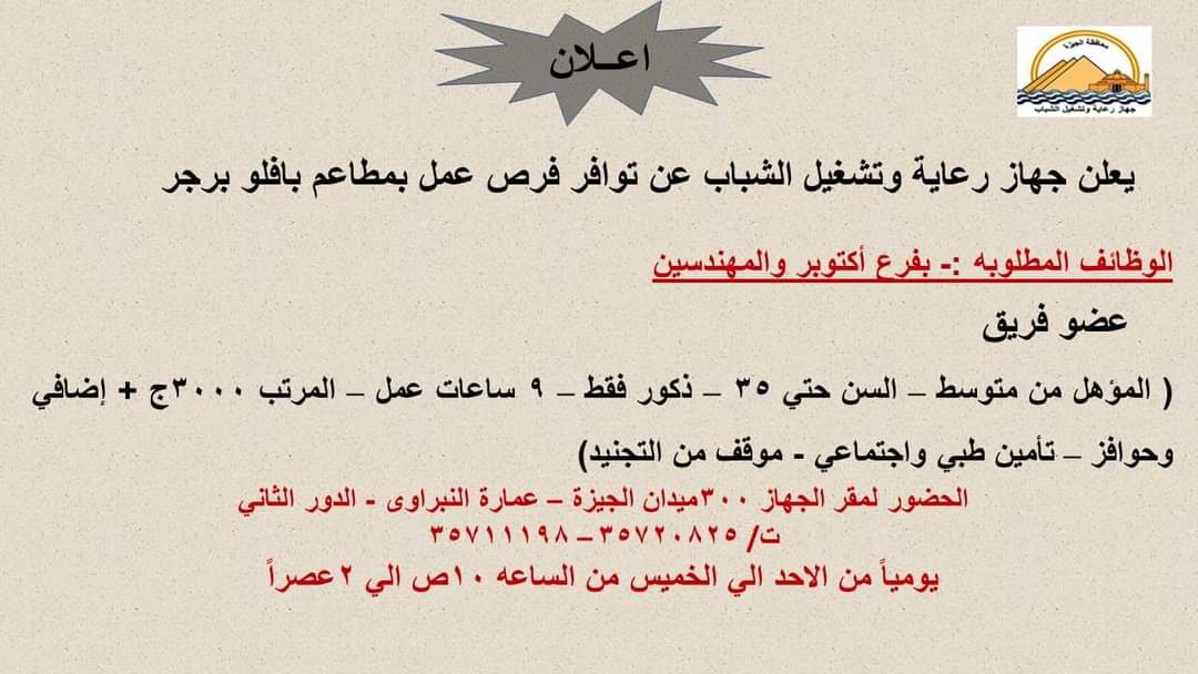 يعلن جهاز تشغيل الشباب بمحافظة الجيزة عن توافر فرص عمل بمطاعم بافلو برجر وأوضح الجهاز أن الوظائف المطلوبة بفرعي اكتوبر والمهندسين وأشار الجهاز إلى أن الوظائف تشمل عضو فريق.