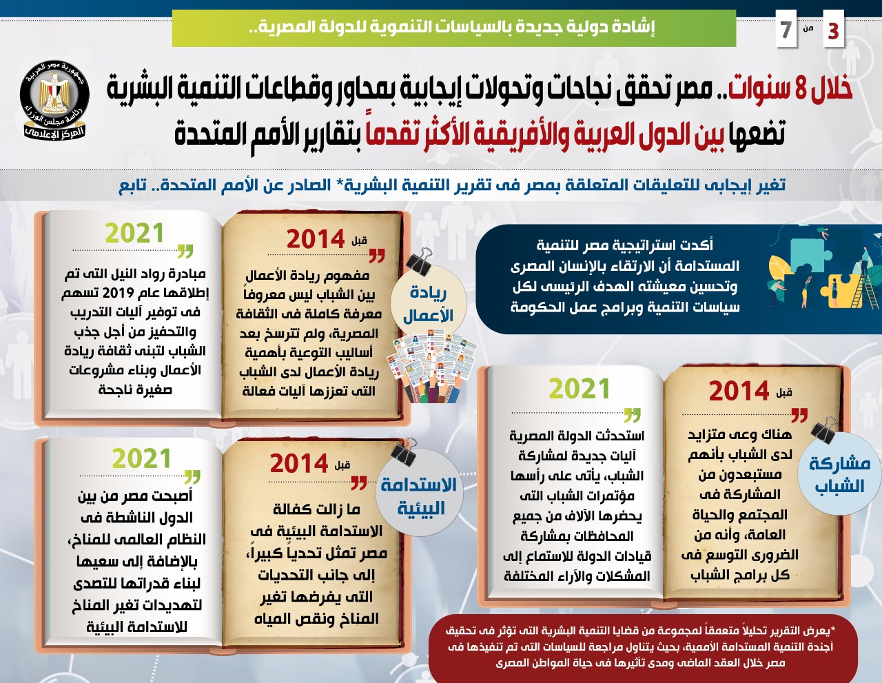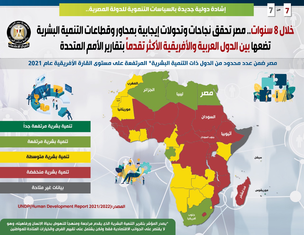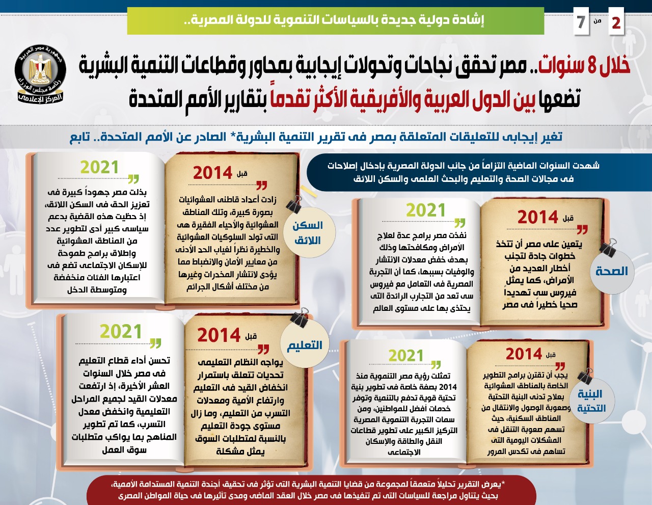وفي هذا الصدد نشر المركز الإعلامي لمجلس الوزراء تقريرًا تضمن إنفوجرافات تسلط الضوء على ما حققته مصر من نجاحات وتحولات إيجابية بمحاور وقطاعات التنمية البشرية خلال 8 سنوات، وضعتها بين الدول العربية والأفريقية الأكثر تقدمًا بتقارير التنمية البشرية التي تصدر عن الأمم المتحدة، وهو ما يمثل إشادة دولية جديدة بالسياسات التنموية للدولة المصرية.
