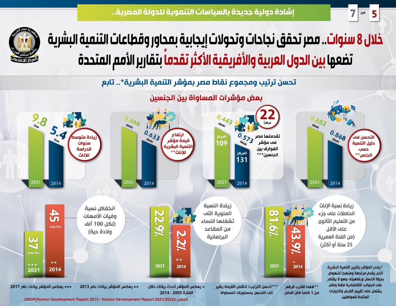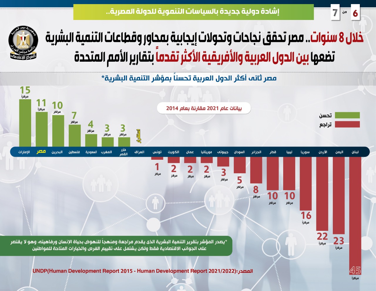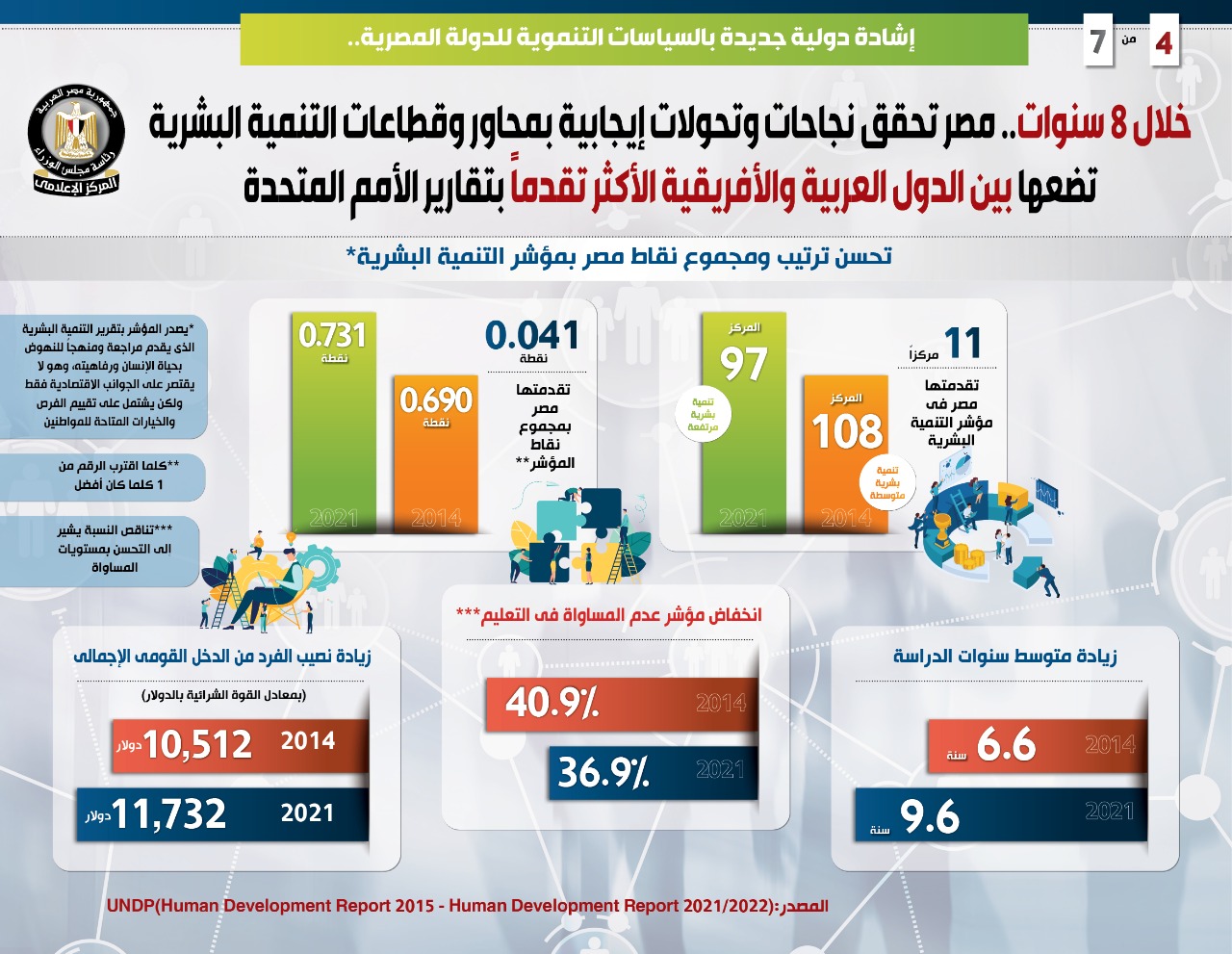 وفي هذا الصدد نشر المركز الإعلامي لمجلس الوزراء تقريرًا تضمن إنفوجرافات تسلط الضوء على ما حققته مصر من نجاحات وتحولات إيجابية بمحاور وقطاعات التنمية البشرية خلال 8 سنوات، وضعتها بين الدول العربية والأفريقية الأكثر تقدمًا بتقارير التنمية البشرية التي تصدر عن الأمم المتحدة، وهو ما يمثل إشادة دولية جديدة بالسياسات التنموية للدولة المصرية.