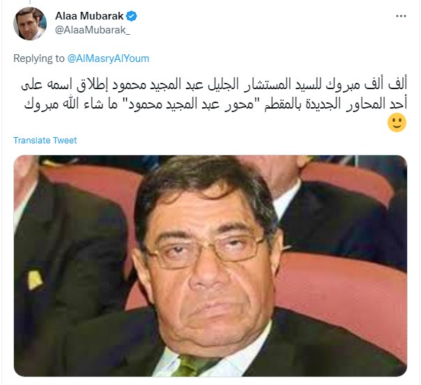 وكتب علاء مبارك في رسالته التي وجهها لعبد المجيد محمود عبر تويتر: "ألف ألف مبروك للسيد المستشار الجليل عبد المجيد محمود إطلاق اسمه على أحد المحاور الجديدة بالمقطم "محور عبد المجيد محمود" ما شاء الله مبروك" .